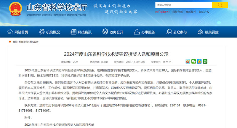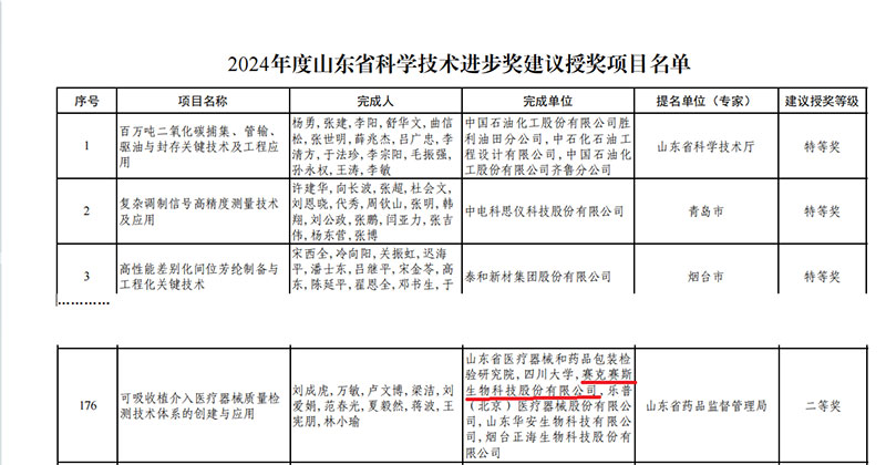 近日,山東省科技廳公布《2024年度山東省科學技術獎建議授獎人選的項目公示》,賽克賽斯生物科技股份有限公司作為參與單位之一完成的“可吸收植介入醫療器械質量檢測技術體系的創建與應用”項目榮獲2024年度山東省科技進步二等獎。