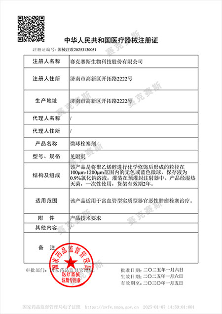近日,公司自主研發的“微球栓塞劑”產品(三類醫療器械)正式獲得國家藥品監督管理局批準上市。該產品適用于富血管型實質型器官惡性腫瘤栓塞治療。該產品具有微球形狀規則、粒徑均一、表面光滑,可壓縮回彈等優點,藍色型可載藥。該產品的上市將為腫瘤介入帶來更優的治療選擇。