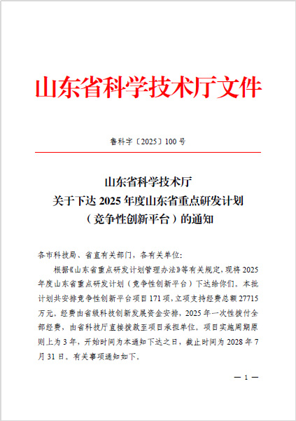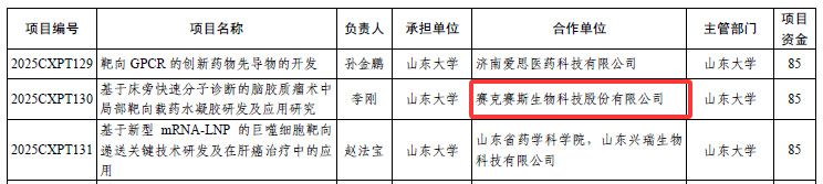 近(jin)日,山東省(sheng)科(ke)技廳(ting)發布(bu)《關于下達2025年度山東省重點研發計(ji)劃(競爭(zheng)性創(chuang)新平臺)的通知》(魯科字(zi)〔2025〕100號(hao)),賽克賽斯生物(wu)科技股份(fen)有(you)限(xian)公司作為(wei)合作單位與山東大學齊魯醫院聯合申報(bao)的“基于床(chuang)旁快速分(fen)子診斷的腦(nao)膠(jiao)質瘤(liu)術(shu)中局(ju)部(bu)靶向載藥水凝膠(jiao)研發及應用研究 ”項目成功(gong)入選。