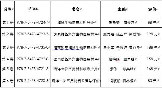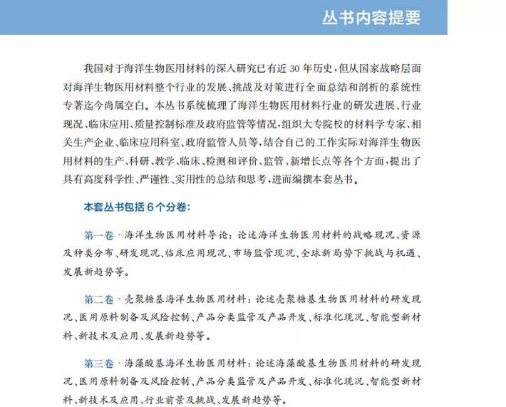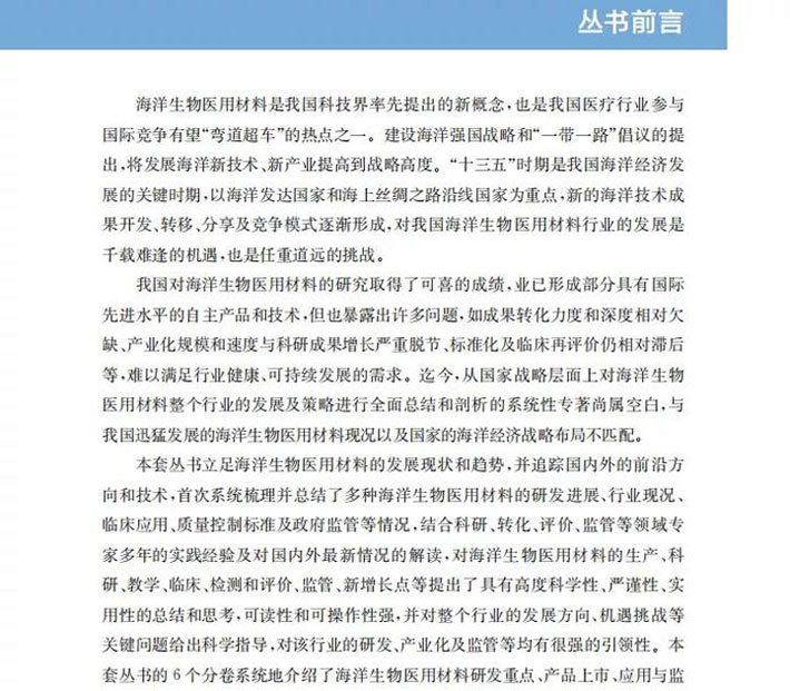 ? 叢書的出版不僅可為從事海洋生物醫用材料、轉化醫學研究的工作者和研究生提供參考,還可為從事相關領域產業化的企業、管理人員或行業標準化人員提供思路,同時還可為國家藥品監督管 理局對行業的監管及法規制定提供參考和依據。