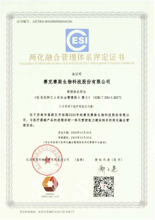 近日,賽(sai)克(ke)賽(sai)斯生物科(ke)技股份有限公司(si)順利(li)通(tong)過國家工(gong)業(ye)和(he)信息化部《信息化和(he)工(gong)業(ye)化融合管理體(ti)系要求》(GB/T23001-2017)體系認證(zheng),獲得兩化融合管理體系評定證(zheng)書。