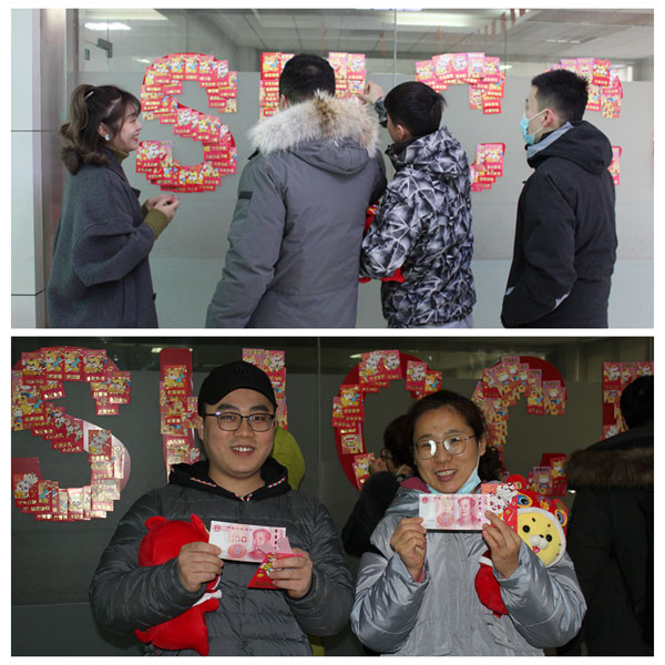 一樓大(da)廳(ting)內(nei)進行(xing)著簡約而又喜(xi)慶的“開年利是”活動,每一(yi)位(wei)員工(gong)在進入工(gong)作崗位(wei)之(zhi)前(qian)都(dou)可以在紅包墻上抽(chou)取(qu)一(yi)個紅包,討個新(xin)年好彩頭;都(dou)可以領取(qu)一(yi)個虎年吉祥(xiang)物,象(xiang)征著新(xin)的一(yi)年如虎添翼、虎虎生威。