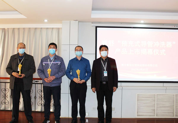 在全體參會人員(yuan)的(de)熱烈(lie)掌(zhang)聲中,董(dong)事長鄒方明和(he)總工程師(shi)趙成(cheng)如為賽舒“預充式導管沖(chong)洗器”產品上(shang)市揭幕。隨后,鄒方明董事(shi)長向參與(yu)賽舒產品上(shang)市做出突(tu)出貢獻(xian)的相關(guan)部門頒(ban)發榮譽獎(jiang)杯。