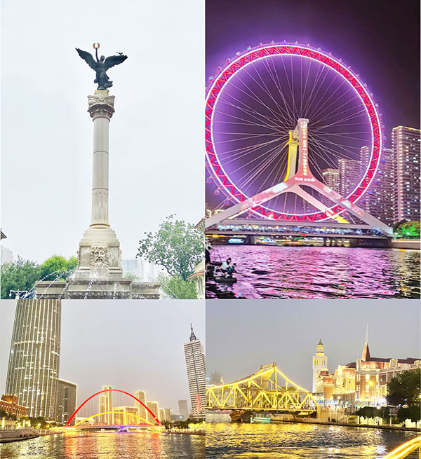 吃過晚飯后,大家坐上了海河游船,游船從碼頭出發,依次通過了燈火通明的大光明橋、解放橋、永樂橋等橋梁,兩岸的津灣廣場、津門津塔一大批現代化摩天大樓傲然起立,十分搶眼。腳下這一灣海河水波光瀲滟,游船在其中穿梭,有人靜坐將此刻美景盡收眼底,有人船頭簇擁感受此刻涼爽的晚風。