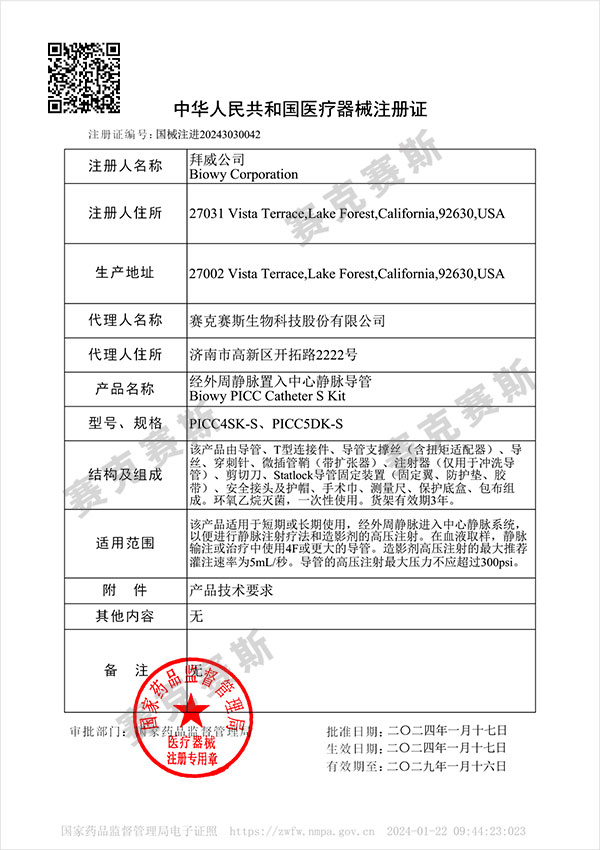 近日,由我公司代理注冊的美國拜威公司(Biowy Corporation)“經外周靜脈置入中心靜脈導管(Biowy PICC Catheter S Kit)”產品成功獲批國家藥監局進口第三類醫療器械注冊證。